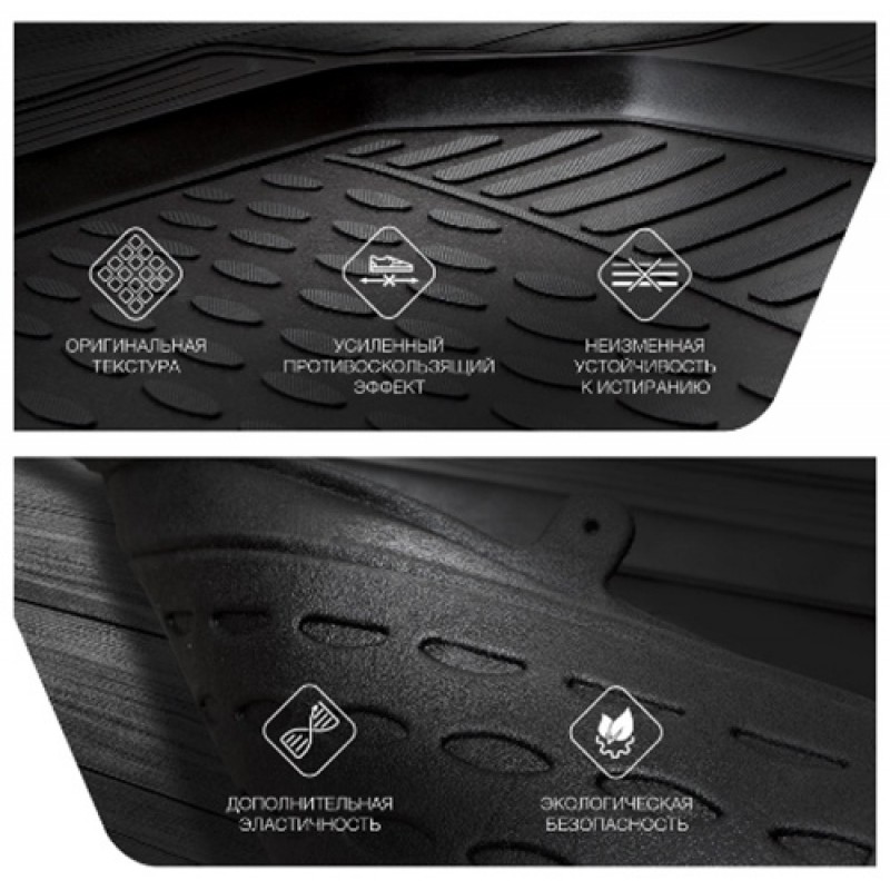 Коврики устойчивы к истиранию. Благодаря высоким бортикам, надежно защищают внутреннюю обивку салона от грязи и снега. Передняя часть водительского коврика уходит под педаль акселератора, что исключает нештатное зацепление педали.