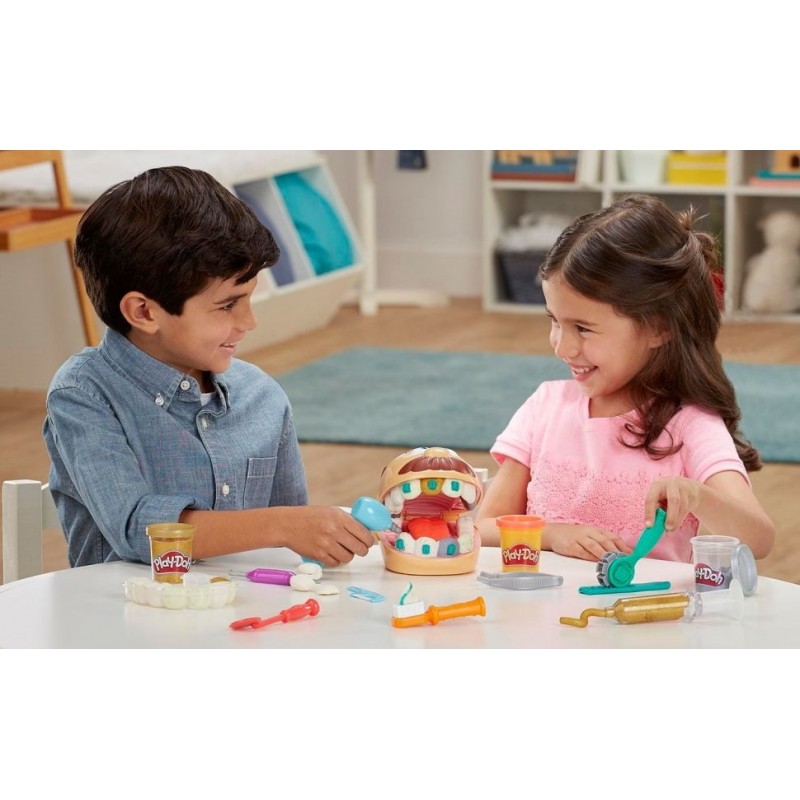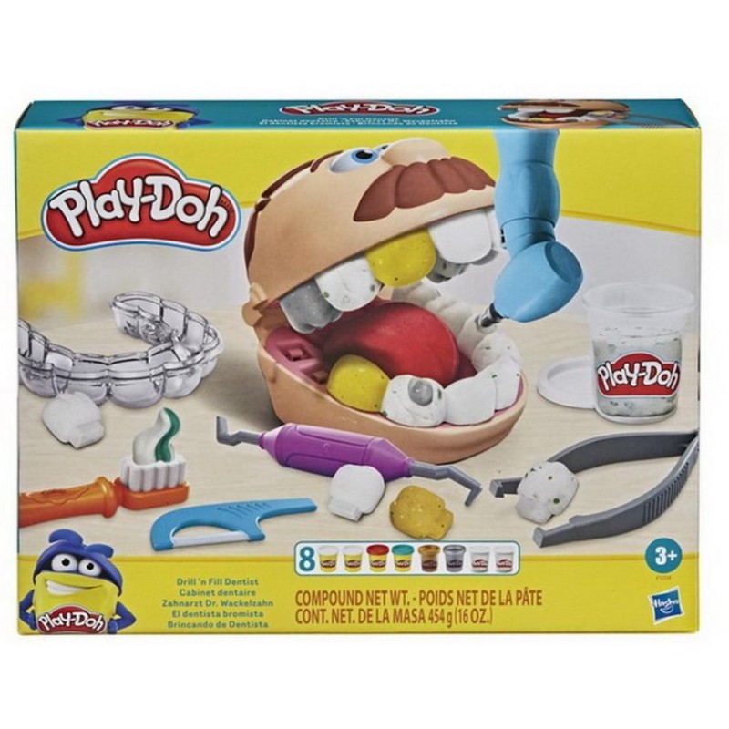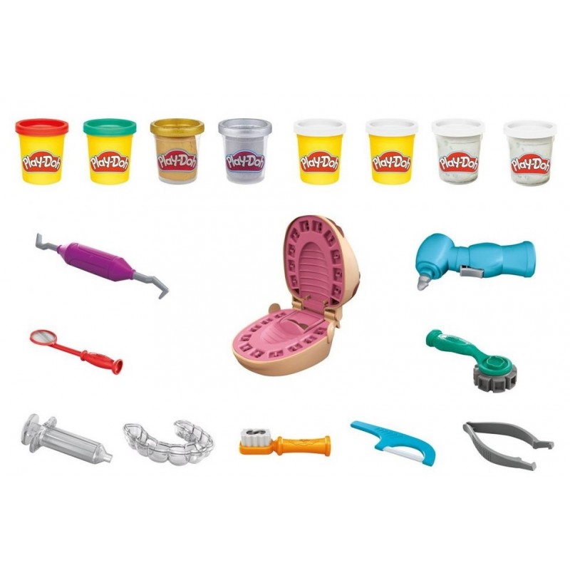| Intra in set | 8 borcane de masă sculptantă Play-Doh (454 g), capul pacientului, burghiu, role-suport, matriță pentru sculptarea dinților, periuta de dinti, seringă, oglindă, cârlig, ață dentară, pensetă |