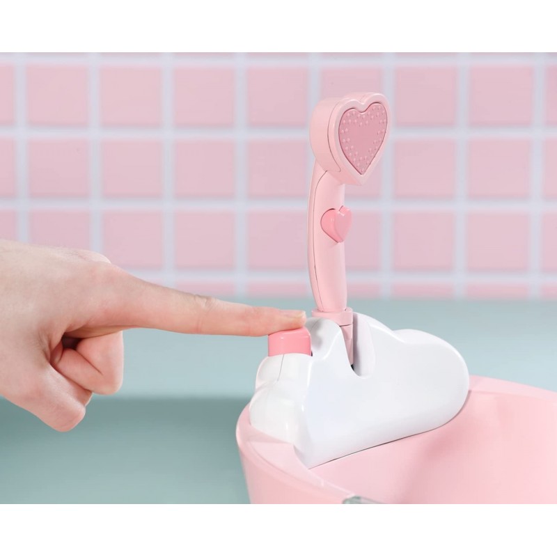 Поместите Малышку Аннабель в ванну, нажмите розовую кнопку и наблюдайте, как «вода» поднимается с обеих сторон ванны, открывая подводный узор! Похоже, Малышка Аннабель плещется в ванне — вода не выливается в стороны. Кнопка в форме сердца на лейке душа издает звуковой эффект брызг и даже включает розовый свет! После душа снова нажмите розовую кнопку, и вы почувствуете, что вода уходит! Пора надеть пижаму, Малышка Аннабель, и уложить ее спать!