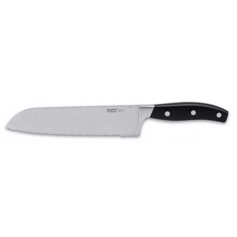 Универсальный набор ножей для всех кулинарных задач.Нож для очистки - маленький и легкий, с прямой режущей кромкой. Это по-настоящему универсальный нож, идеальный для очистки и других мелких работ. Часто используется для очистки фруктов и овощей, которые можно держать в руках.Если другие ножи используются на кухне для приготовления ингредиентов, ножи для стейка пригодятся уже за столом, когда стейк или другие мясные блюда уже готовы.Универсальный нож идеален для всех нарезочных работ, требующих точности.Нож Сантоку - нож в азиатском стиле с прямой кромкой лезвия. Это универсальный нож для различных кухонных работ. Широкое лезвие подходит и для некоторых специфических задач, таких как раздавливание чеснока и сбор нарезанных ингредиентов на лезвие.Нож для хлеба - большой нож с зубчатым лезвием. Используется для нарезания продуктов, твердых снаружи и мягких внутри, таких как хлеб и другая выпечка. Также может использоваться для нарезания томатов. Поварской нож - самый используемый на кухне. Загнутое кверху лезвие позволяет раскачивать нож во время нарезки на разделочной доске. Благодаря широкому и тяжелому лезвию также подходит для легких разрубочных работ.Острый нож безопасней, поскольку не нужно применять силу для нарезки. Это необходимый инструмент, чтобы сохранять ваши ножи острыми.Ножницы для разделки птицы специально разработаны, чтобы прорезать кости, куриную кожу и другие жесткие материалы. Они могут быть использованы как обычные кухонные ножницы, подходящие для целого круга более трудных кухонных нарезочных работ. С дополнительными досками для нарезки, вставляющимися в блок.Колода удобно сохраняет все ножи безопасным образом. Нескользящая платформа обеспечивает дополнительную устойчивость.